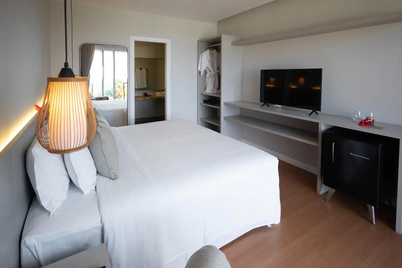Cada quarto foi projetado para oferecer um ambiente de conforto e praticidade. Relaxe em acomodações equipadas com camas king, poltronas aconchegantes, ar condicionado, roupão, amenities e a melhor vista para o mar de Fernando de Noronha.